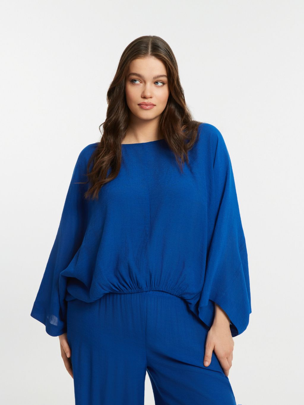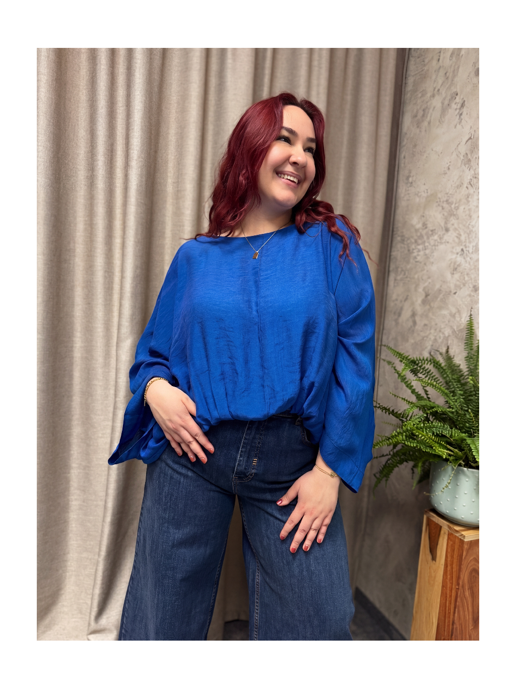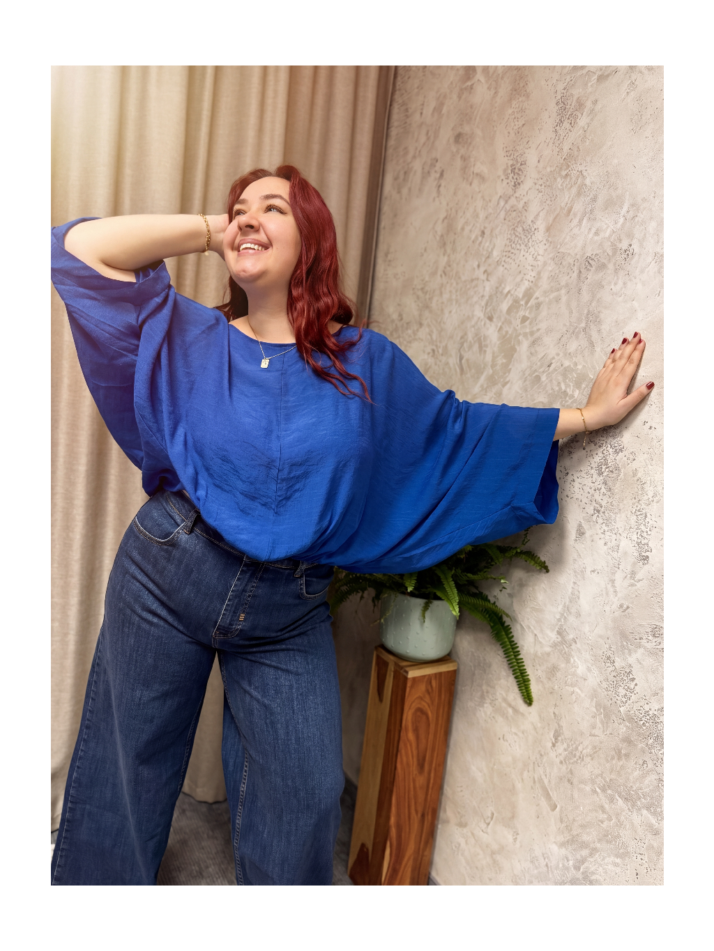 Směs viskózy a polyesteru působí vzdušně, je příjemná na těle a dobře drží tvar, takže se top nedeformuje ani při celodenním nošení. Volné netopýří rukávy opticky zeštíhlují paže a oversize silueta je jako dělaná pro plus size křivky – nic ne táhne, neškrtí a přesto působíš upraveně a chic. Skvěle funguje samostatně i jako horní vrstva přes šaty nebo přiléhavé tílko.