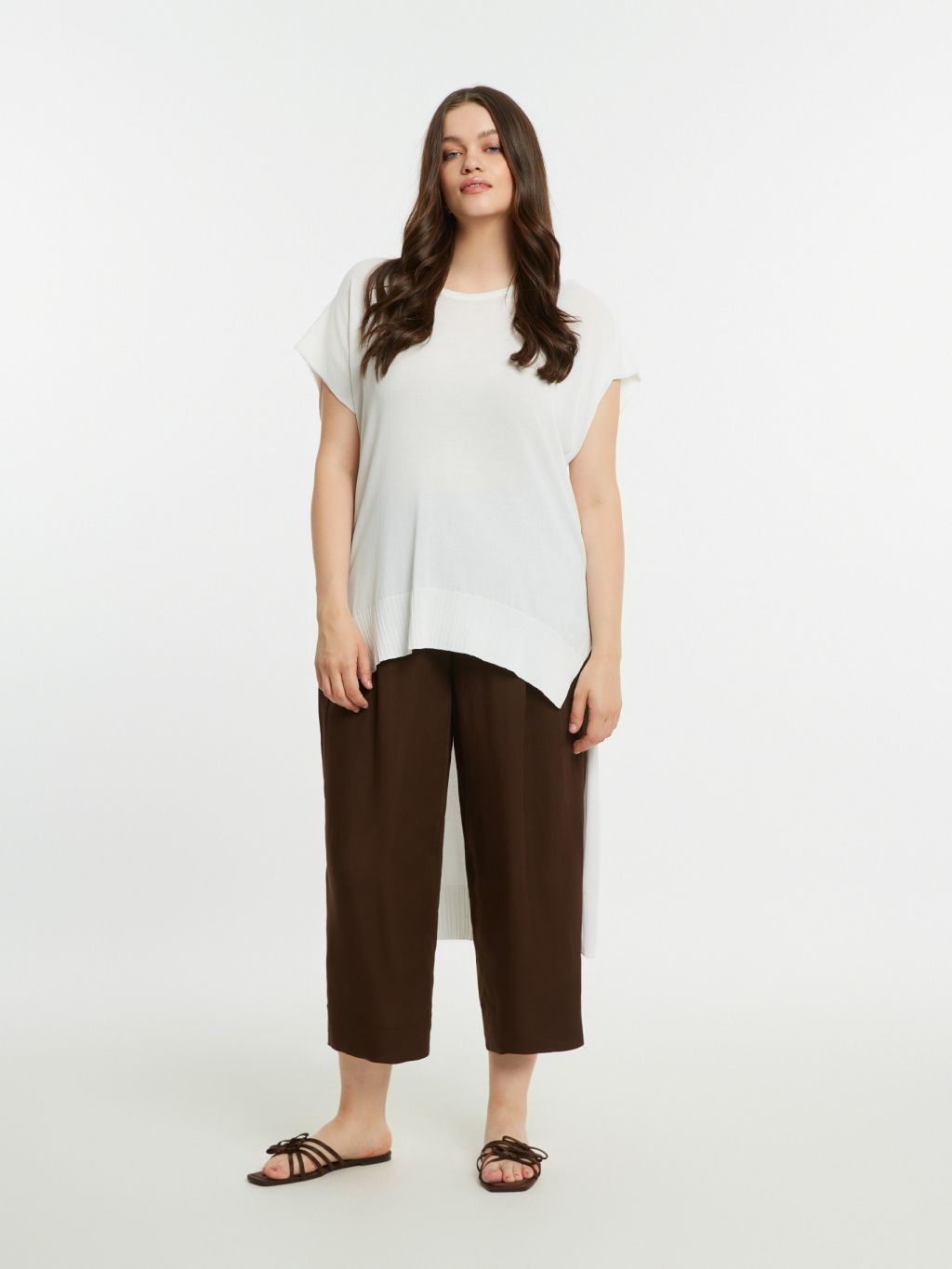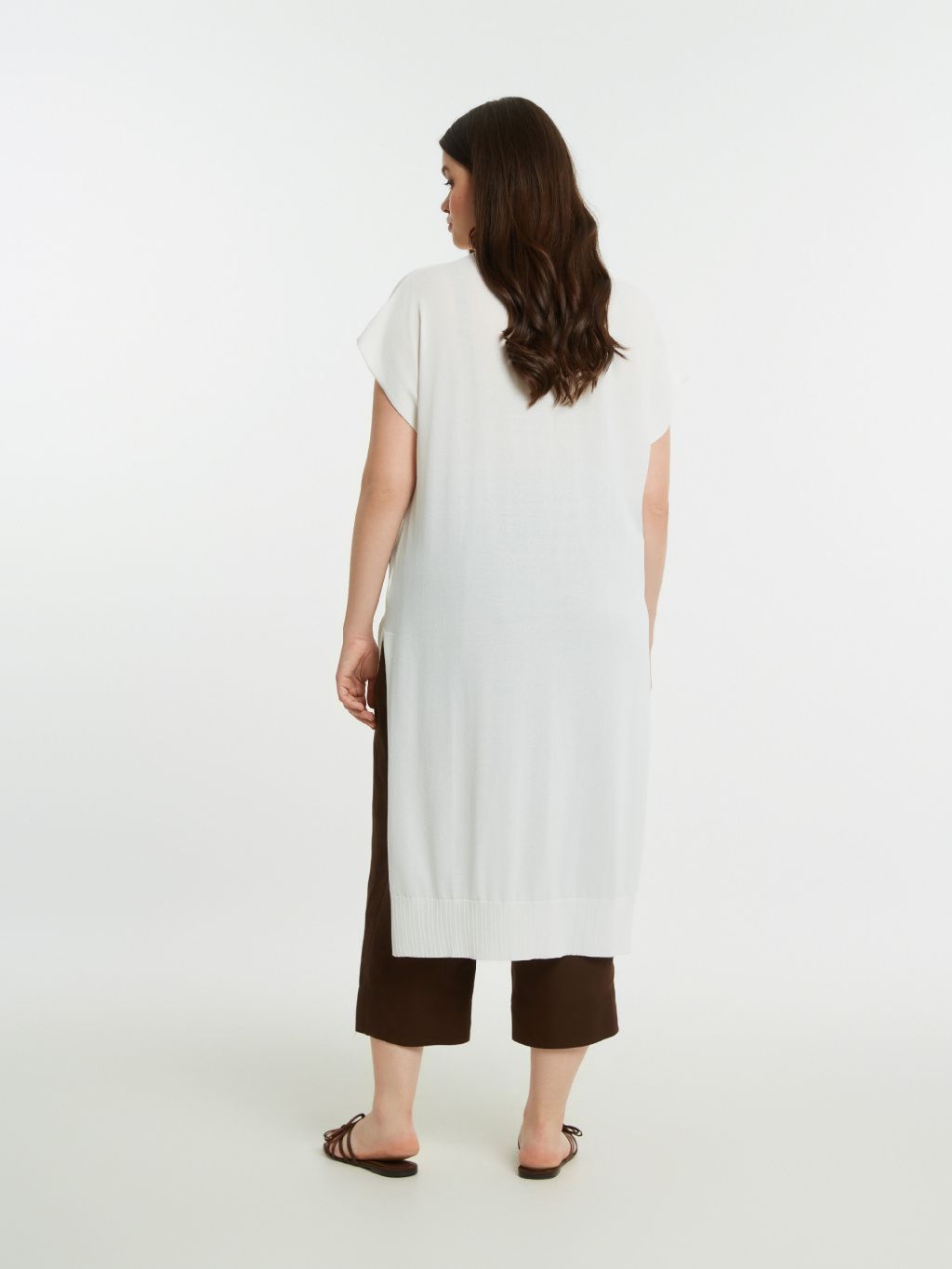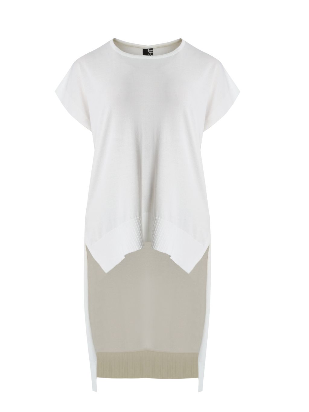 Lehký pletený „štít“ pro dny, kdy chceš být zahalená, ale pořád vzdušná – tunika POISE v jemném úpletu krásně splývá přes křivky a díky delší zadní délce působí moderně, minimalisticky a velmi žensky. Přední díl s originálním barevným blokem a bočními rozparky tvoří zajímavou linii, která zeštíhluje a prodlužuje postavu, aniž by cokoli obepínala.