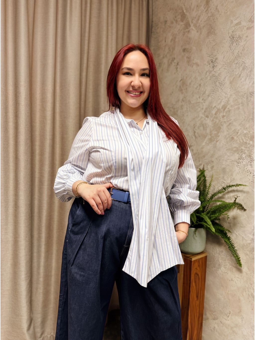 Křehce působící, ale neuvěřitelně sebevědomý kousek, který z klasické košile udělá módní statement – projmutá košile s vázankou od Mat Fashion spojuje finesu pánské košiloviny a ultra ženský detail v podobě velké mašle u krku. Jemný modro‑bílý proužek působí elegantně, projmutý střih krásně kopíruje linii trupu a vytváří upravenou siluetu, která se hodí do kanceláře i na schůzku.
