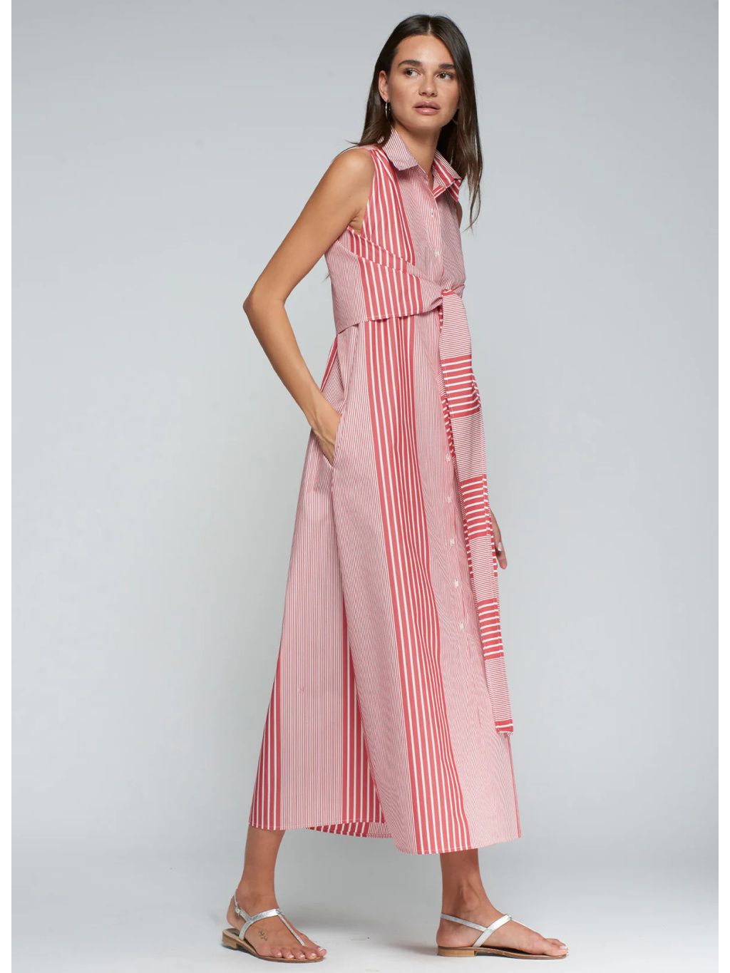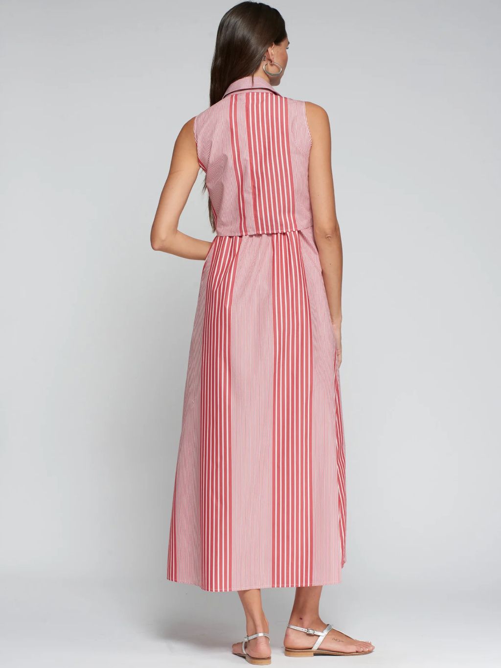 Vertikální pruhy v červenobílé kombinaci prodlouží siluetu a dají tvému looku výraz „ležérně chic“, aniž by působil přehnaně formálně. Maxi košilový střih je rovný, vzdušný a snadno ho přizpůsobíš – můžeš ho nosit volně spuštěný nebo zvýraznit pas páskem.