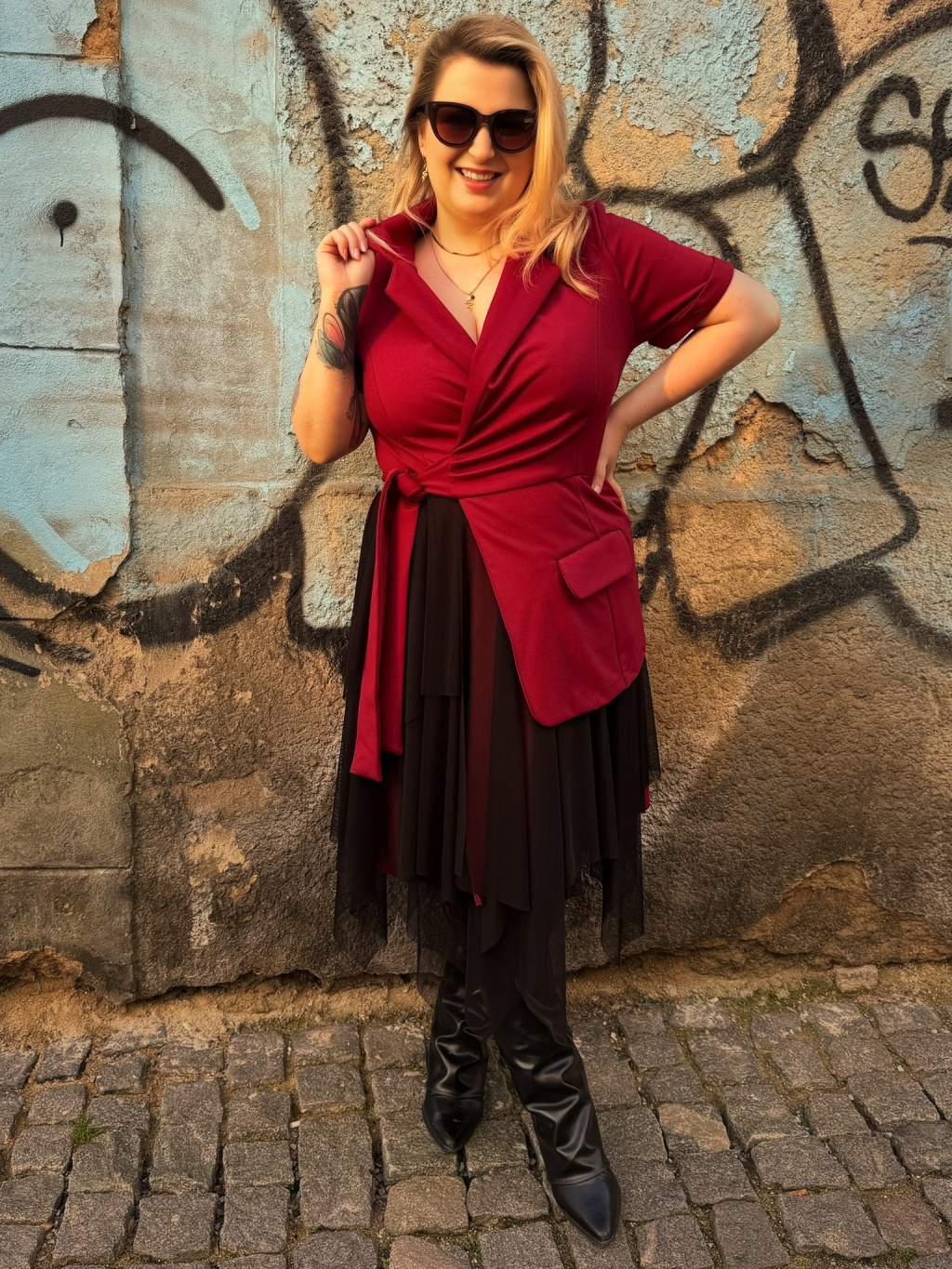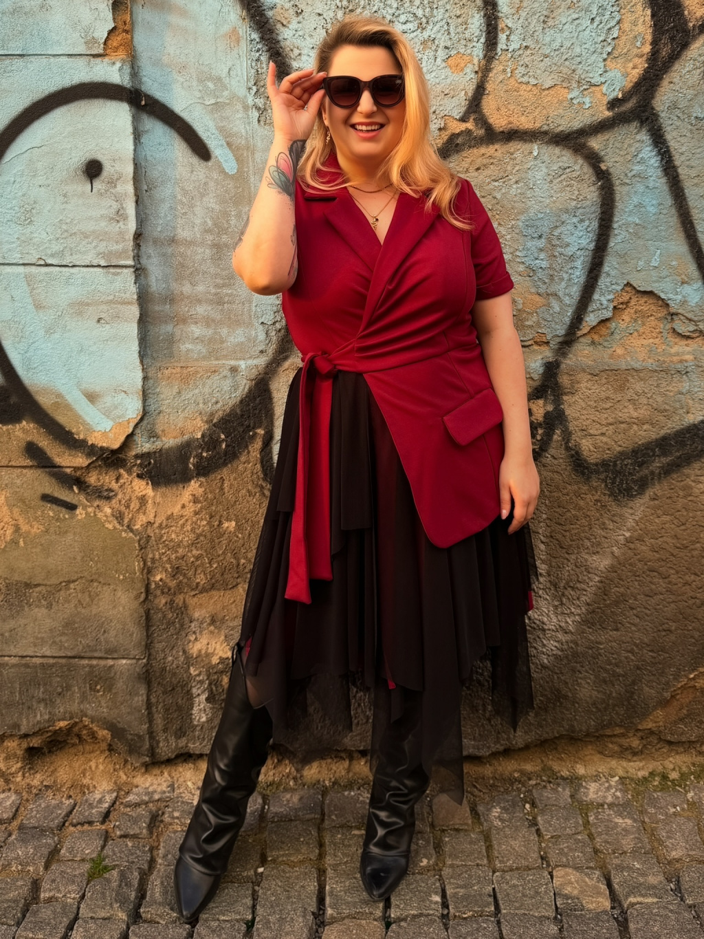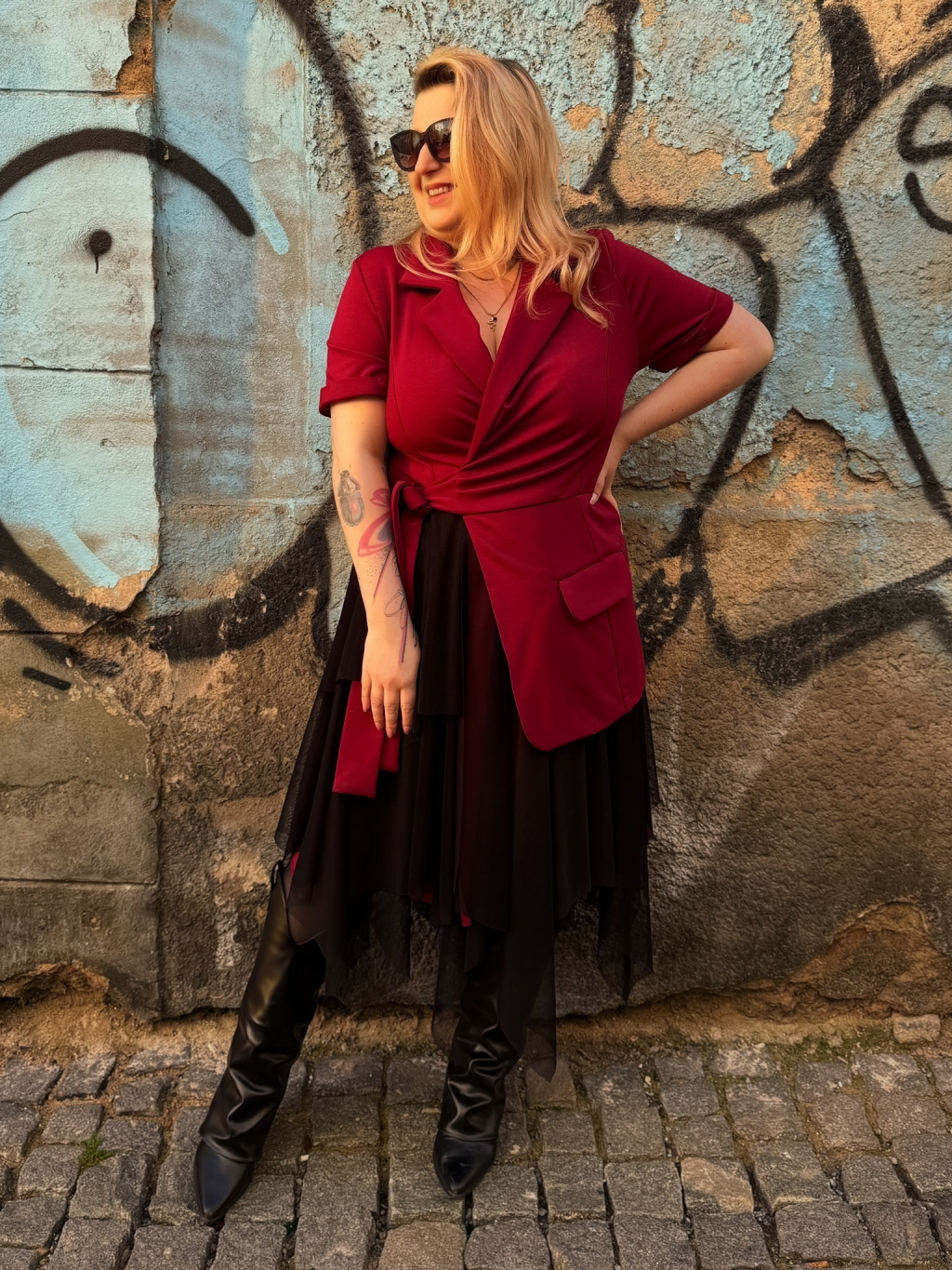 Šaty ROXY v odstínu bordó jsou výrazným a sebevědomým kouskem, který okamžitě přitáhne pozornost a dodá outfitu elegantní dramatický nádech. Charakteristický je jejich zavinovací střih s límečkem, který krásně zvýrazňuje pas a lichotí ženské siluetě. Spodní část tvoří lehce splývavá asymetrická sukně z jemného tylu, která dodává modelu pohyb, lehkost a originalitu. Bordó varianta působí luxusně, sofistikovaně a skvěle se hodí jak na večerní události, tak stylové denní nošení. Tento model je ideální pro ženy, které chtějí spojit eleganci, pohodlí a výrazný styl v jednom kousku.