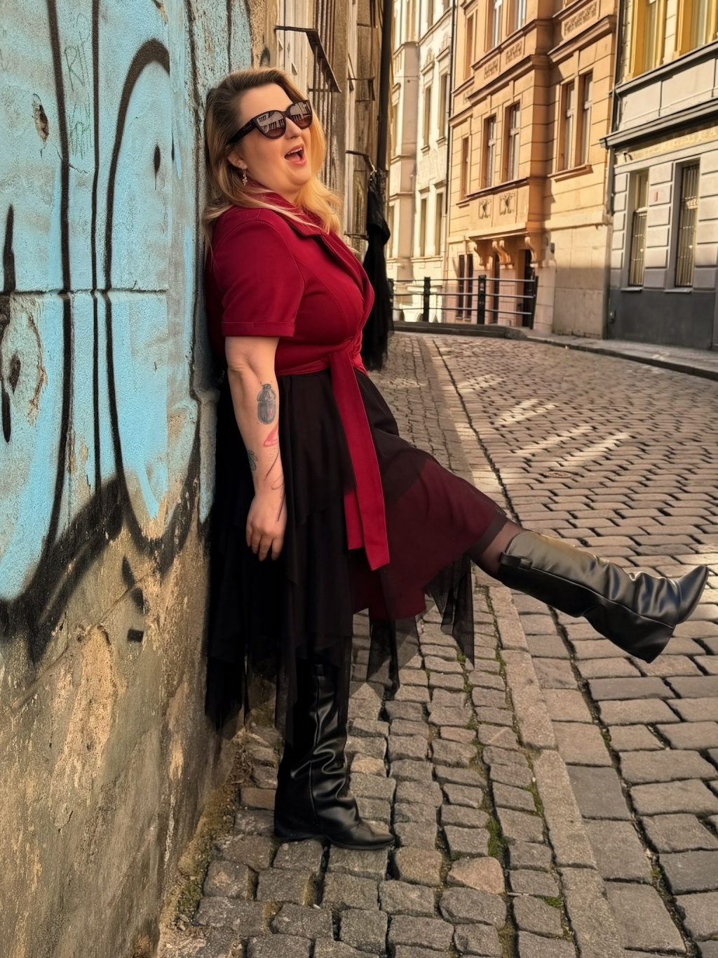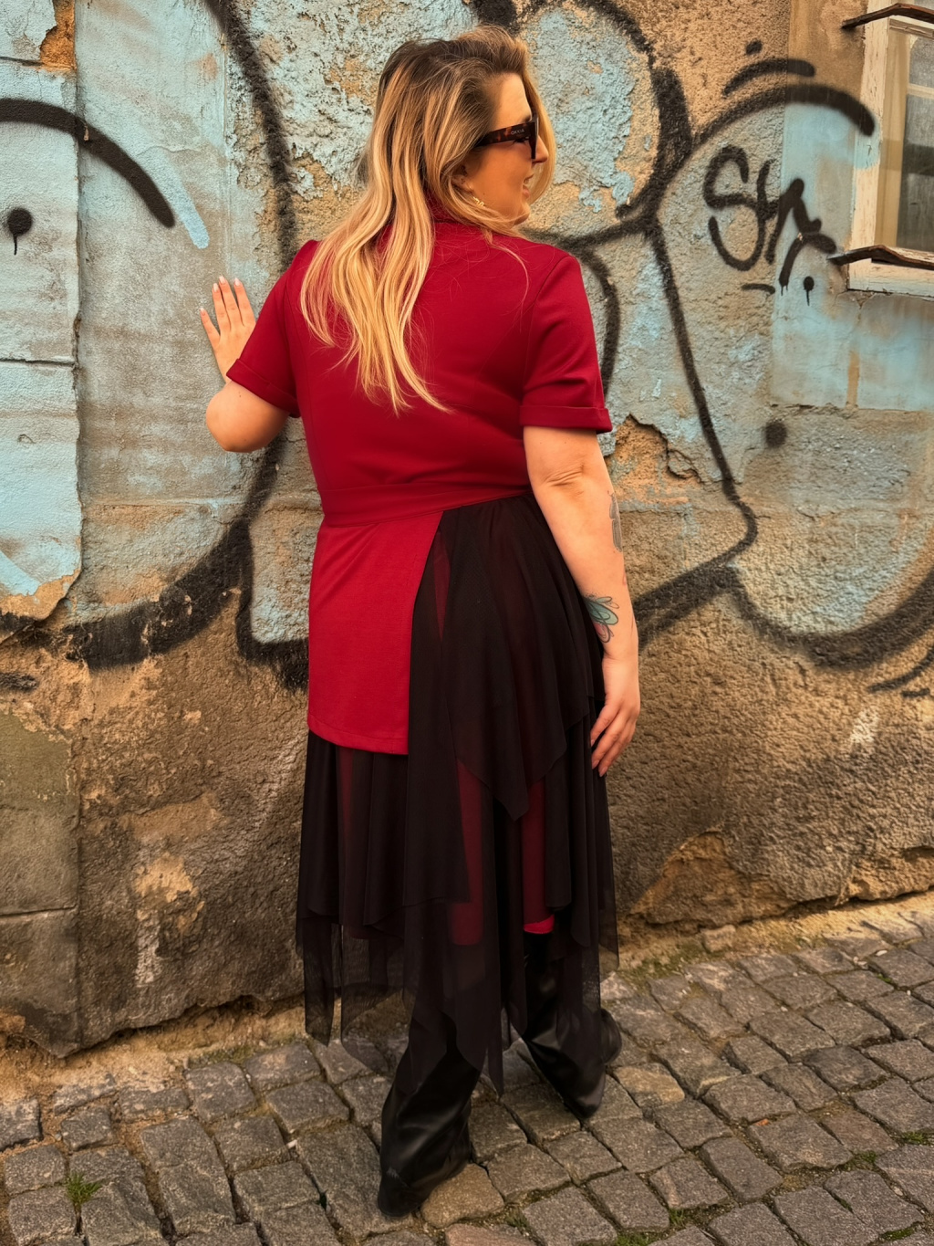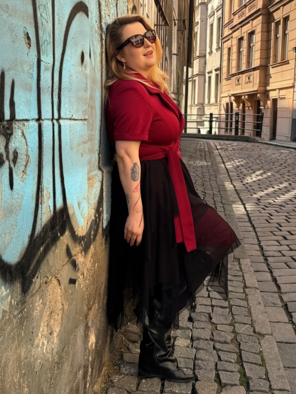 Šaty ROXY v odstínu bordó jsou výrazným a sebevědomým kouskem, který okamžitě přitáhne pozornost a dodá outfitu elegantní dramatický nádech. Charakteristický je jejich zavinovací střih s límečkem, který krásně zvýrazňuje pas a lichotí ženské siluetě. Spodní část tvoří lehce splývavá asymetrická sukně z jemného tylu, která dodává modelu pohyb, lehkost a originalitu. Bordó varianta působí luxusně, sofistikovaně a skvěle se hodí jak na večerní události, tak stylové denní nošení. Tento model je ideální pro ženy, které chtějí spojit eleganci, pohodlí a výrazný styl v jednom kousku.