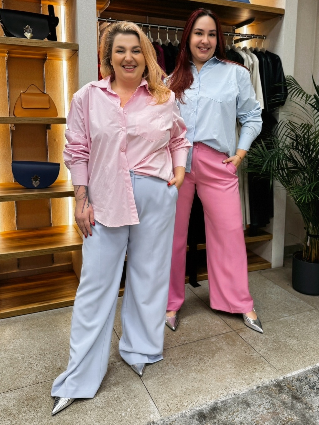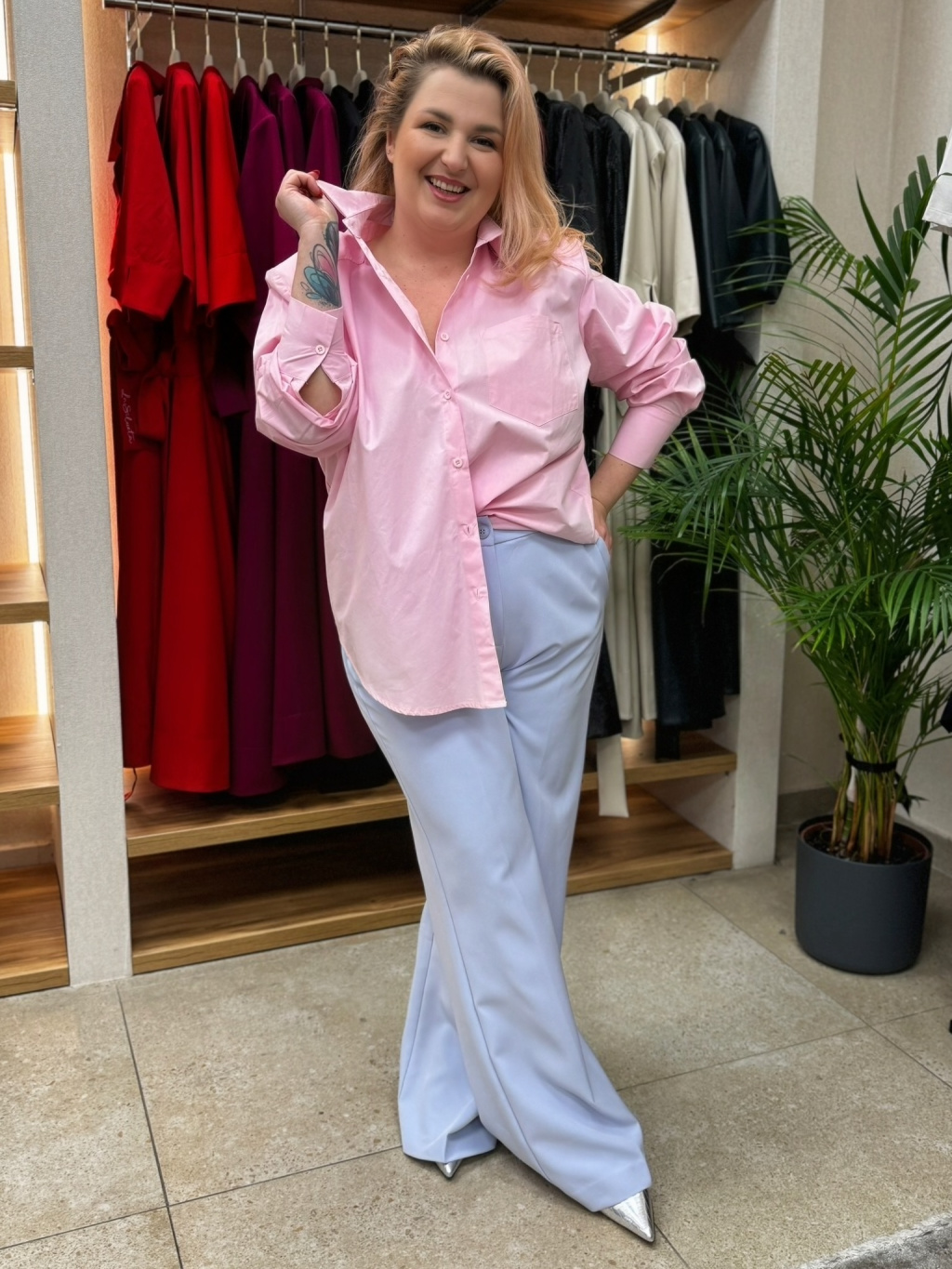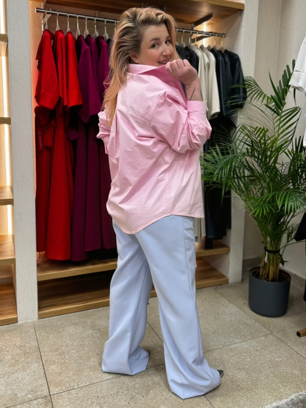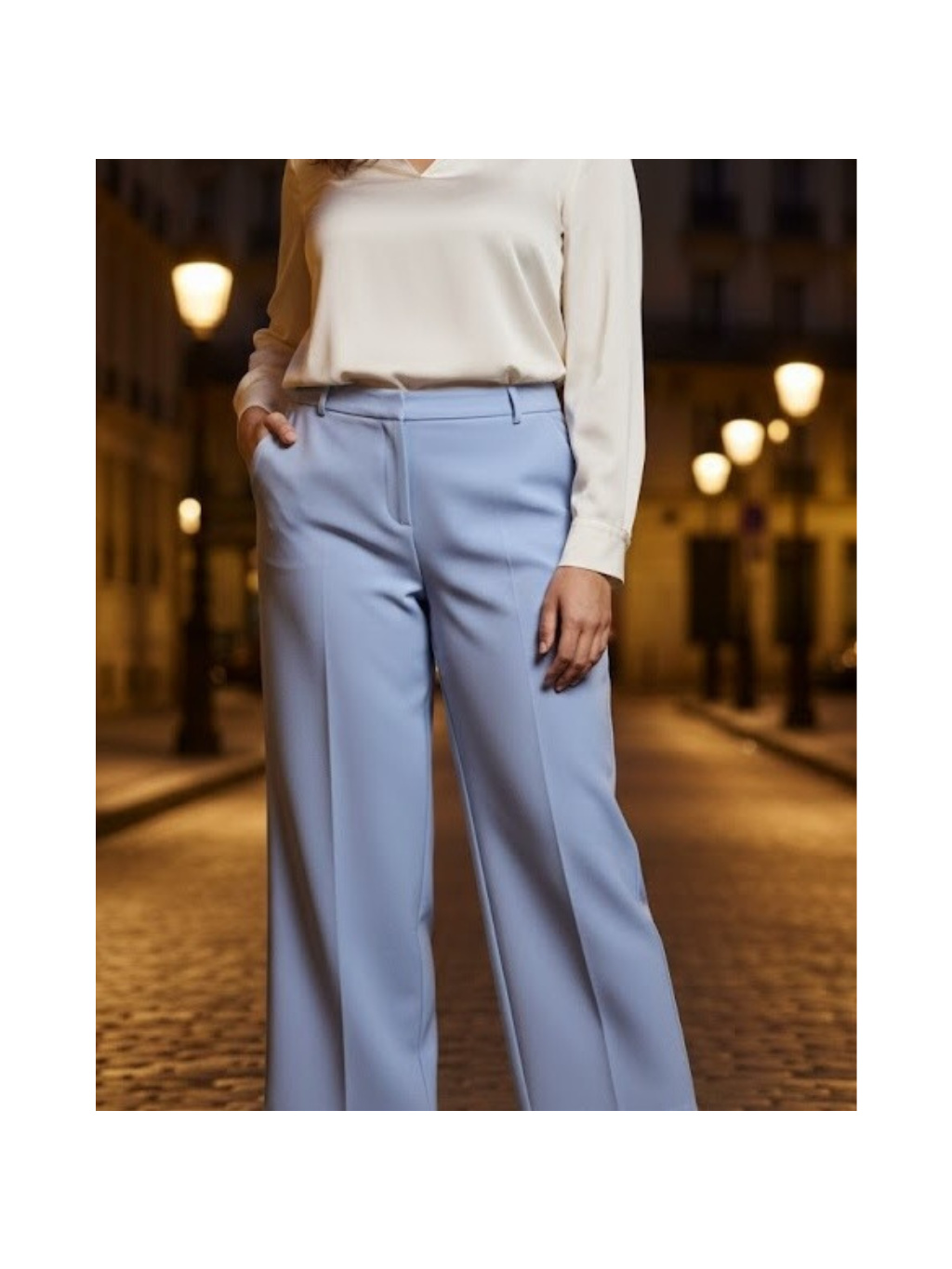 Klasické zapínání dodává kalhotám nadčasovou eleganci, zatímco široké nohavice působí velmi lichotivě a opticky prodlužují siluetu. Barva je ideální pro svěží jarní a letní styling – nádherně ladí s bílou, růžovou, béžovou i pastelovými tóny.