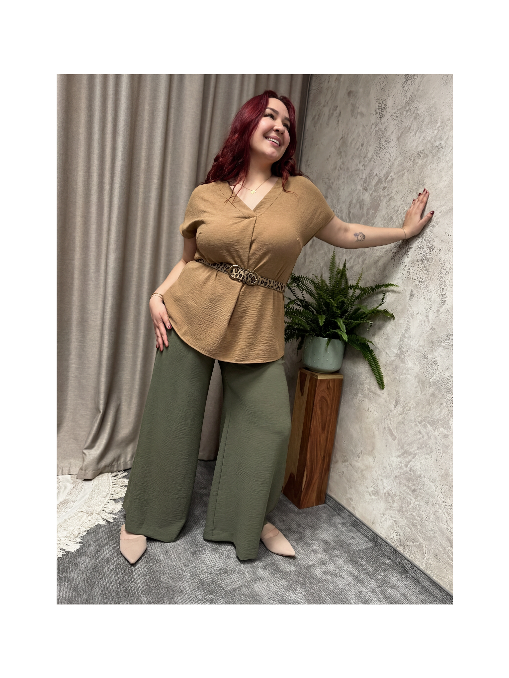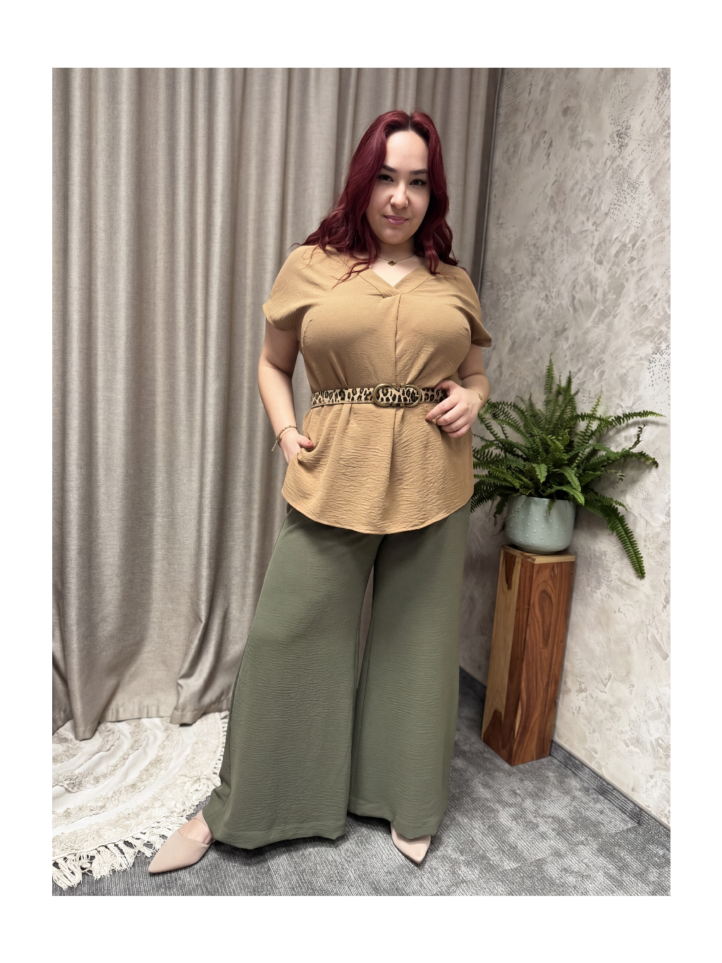 Rozpohybovaná elegance v přírodním tónu – široké kalhoty na gumu Vivienne v khaki odstínu přinášejí stejnou porci pohodlí jako černá varianta, ale s jemně ležérním, „městsky přírodním“ nádechem. Širší, volně splývavé nohavice vytvářejí krásnou linii nohou, guma v pase se přizpůsobí křivkám a praktické kapsy dodají uvolněně chic dojem, který unosíš od kanceláře až po víkend.