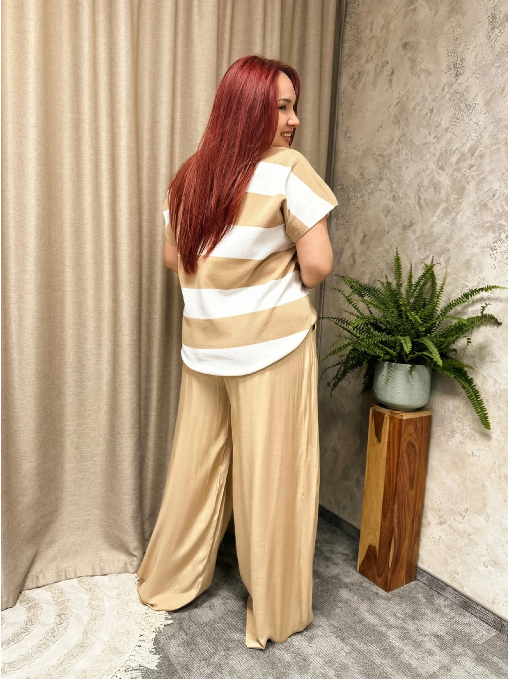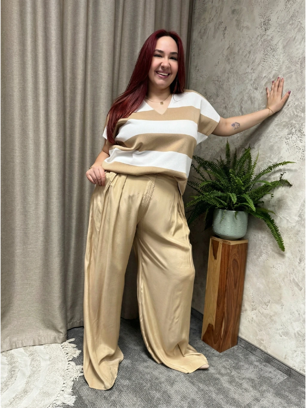 Tyhle široké kalhoty se sklady v odstínu pískově béžové jsou sebevědomý, stylový kousek, který okamžitě rozzáří celý outfit. Volné, splývavé nohavice krásně obkreslí siluetu bez toho, aby cokoliv obepínaly, a díky skládání v přední části působí kalhoty elegantněji než běžné „volnočasové“ modely. Pohodlný střih s dostatkem místa přes boky a stehna lichotí křivkám a při chůzi vytváří efektní, plynulý pohyb.