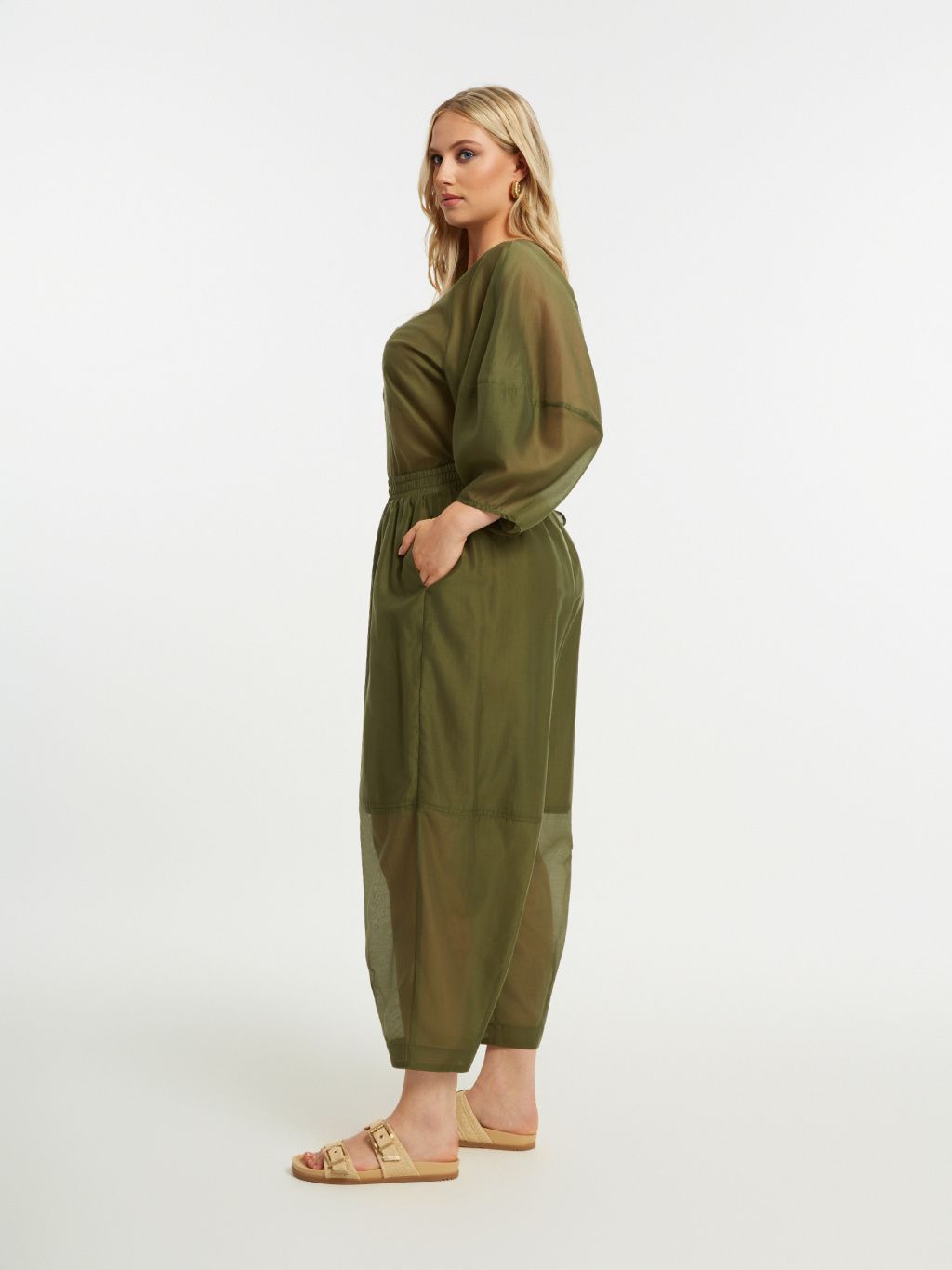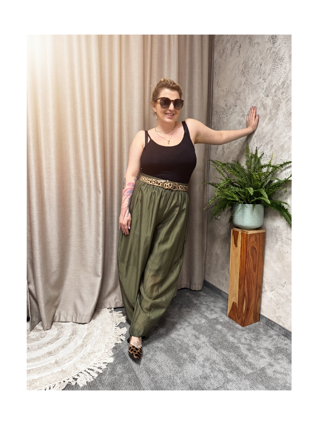 Lehkost, vzdušnost a pohodlí v plus size podání – soudkové kalhoty Sereno v khaki odstínu jsou jako stvořené pro dny, kdy nechceš nic, co by tě svíralo. Měkce spadlý „soudkový“ tvar s gumu v pase kopíruje křivky bez tlačení, prosvítavý efekt na nohavicích působí moderně a dodává jinak jednoduchému kousku módní šmrnc.