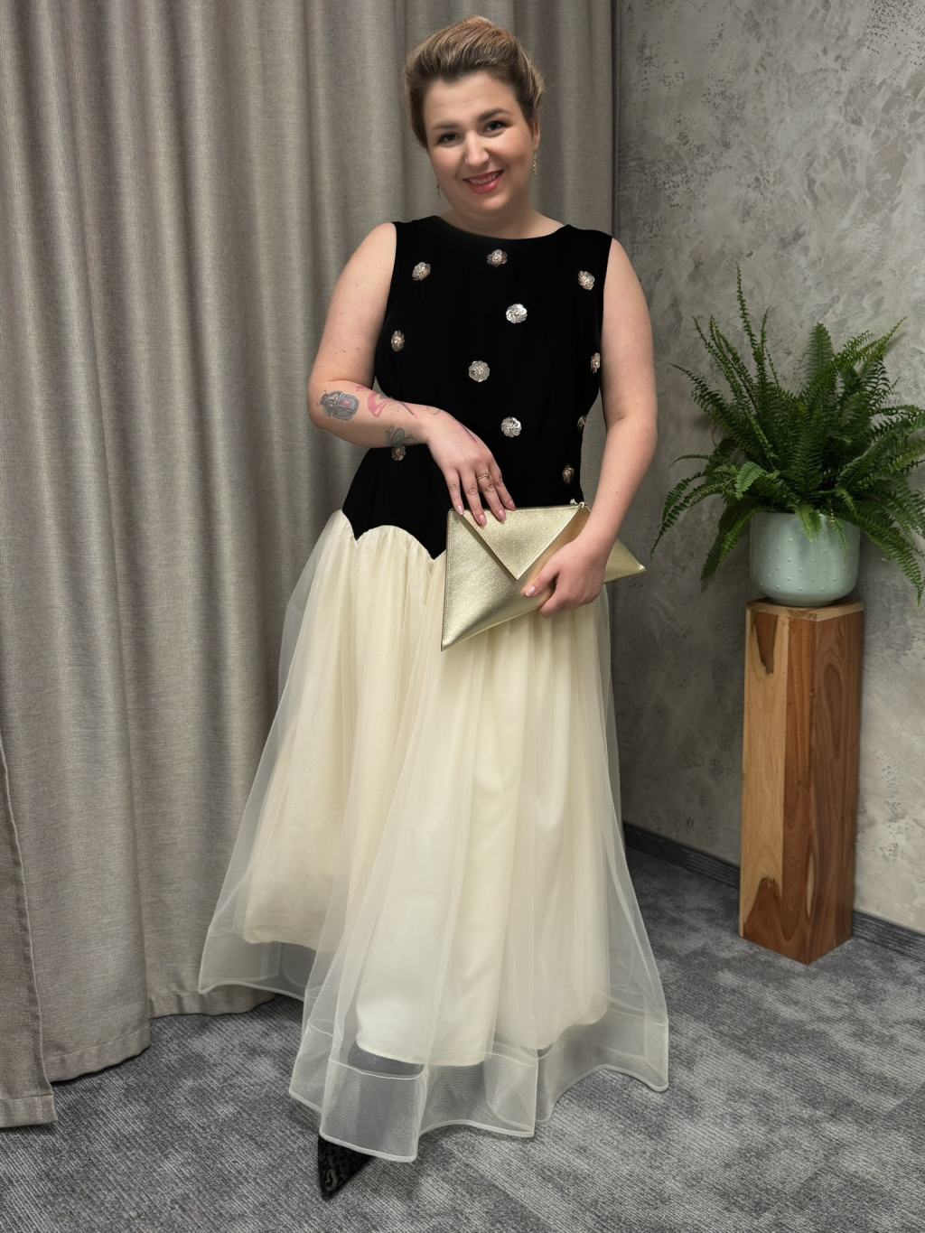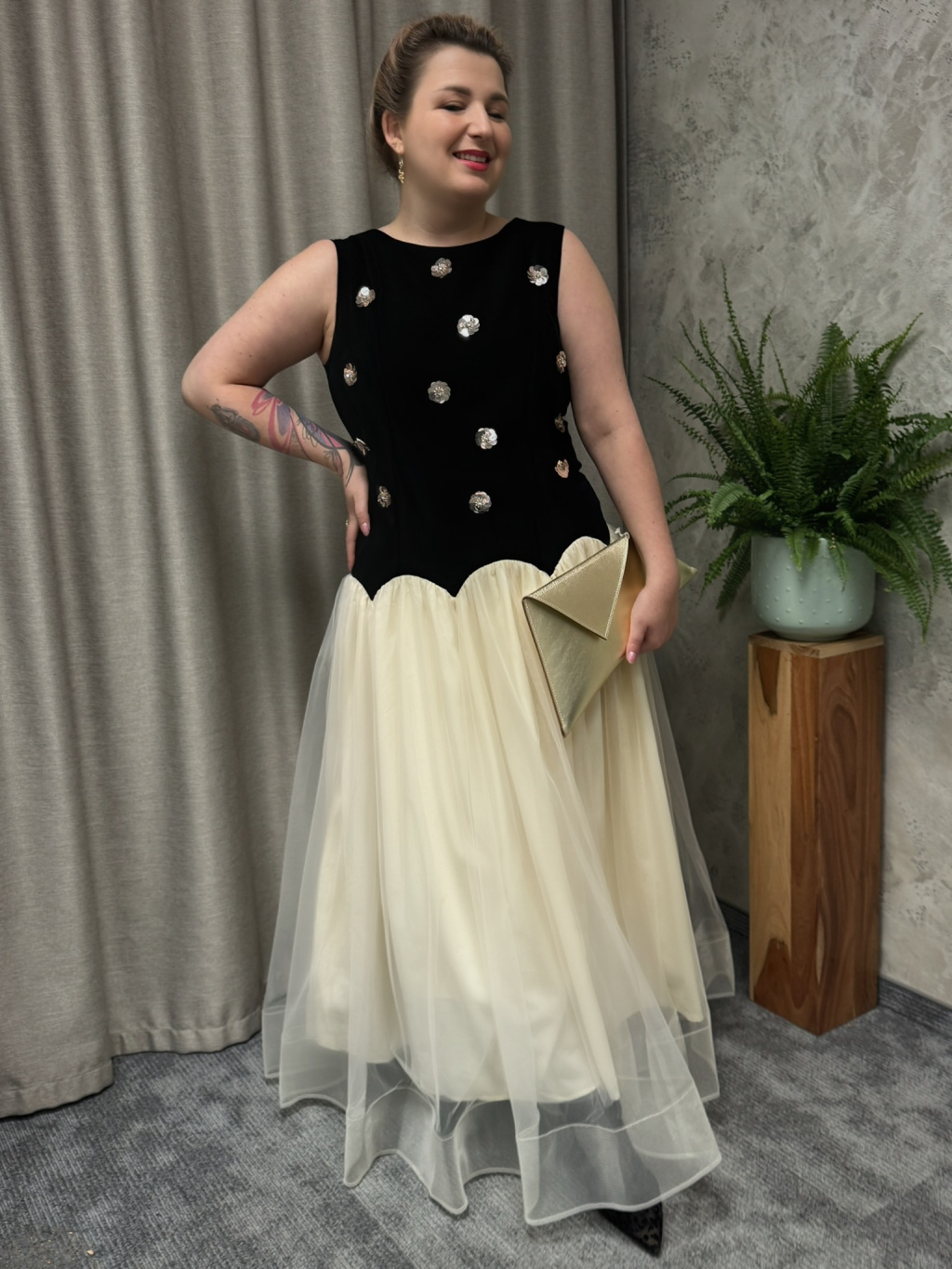 Elegantní společenské šaty ROTO jsou ztělesněním sofistikovanosti a ženského půvabu. Model zaujme kontrastním provedením, které propojuje minimalistickou siluetu s výraznými detaily. Vrchní část zdobí jemné aplikace, které šatům dodávají slavnostní charakter a decentní lesk. Nadýchaná tylová sukně pak vytváří lehkost a pohyb při každém kroku.
