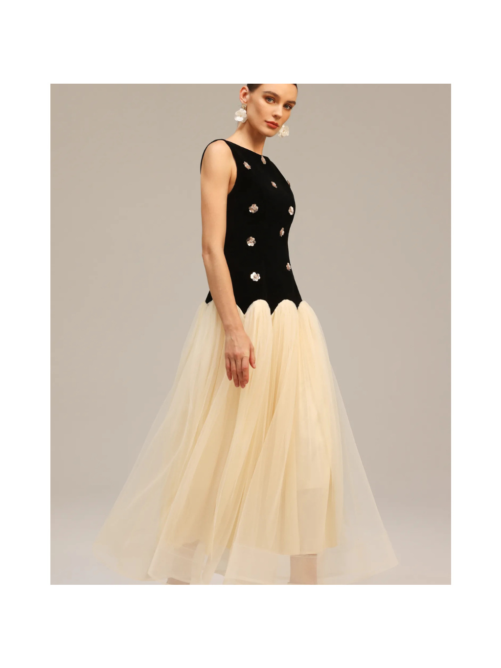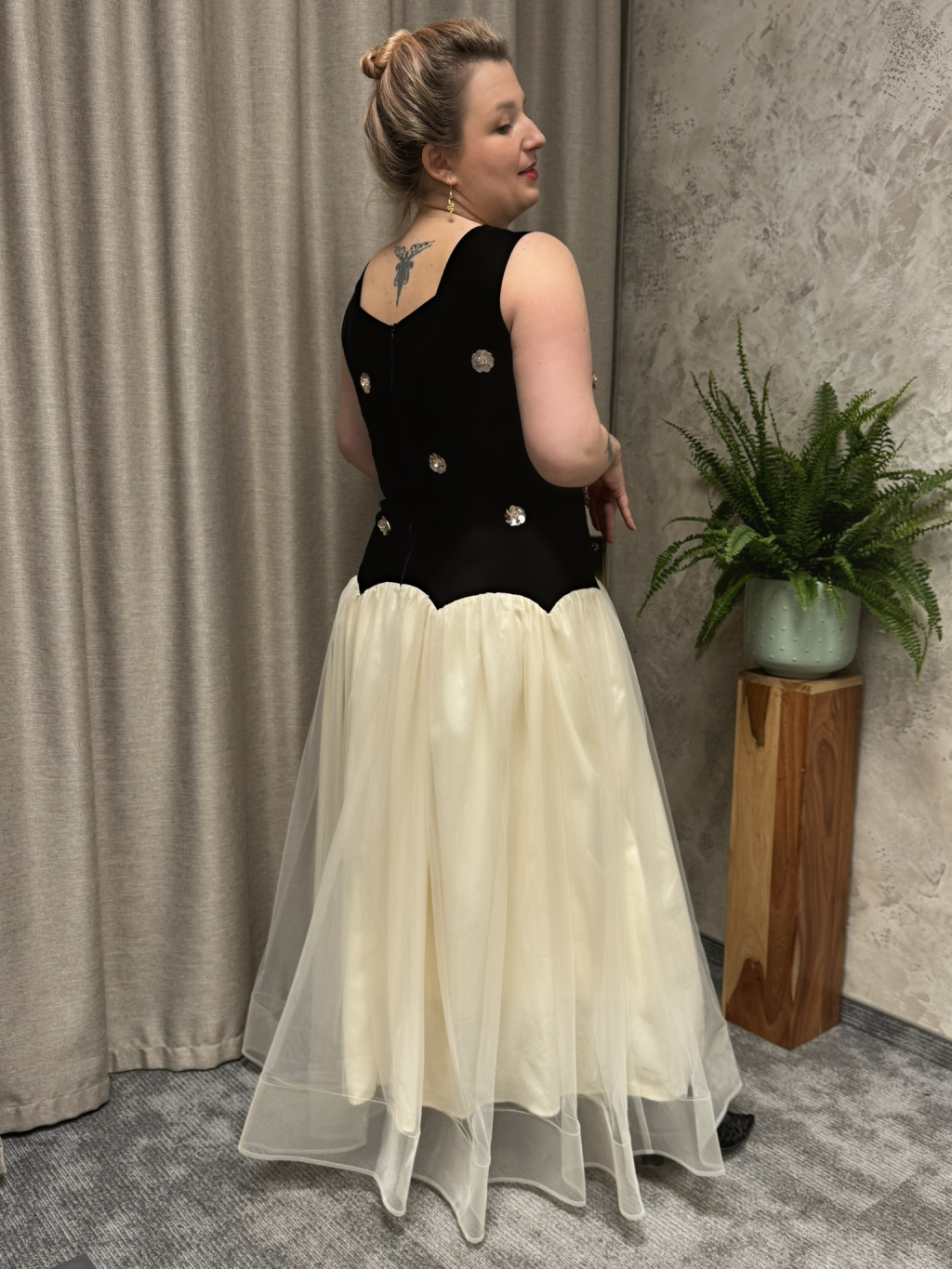 Šaty mají přiléhavý, strukturovaný živůtek bez rukávů s kulatým výstřihem, který elegantně zvýrazňuje linii ramen a krku. Pas je přirozeně zvýrazněný a přechází do bohaté, vrstvené tylové sukně v jemném krémovém odstínu. Spodní část působí vzdušně, romanticky a dodává modelu slavnostní objem.