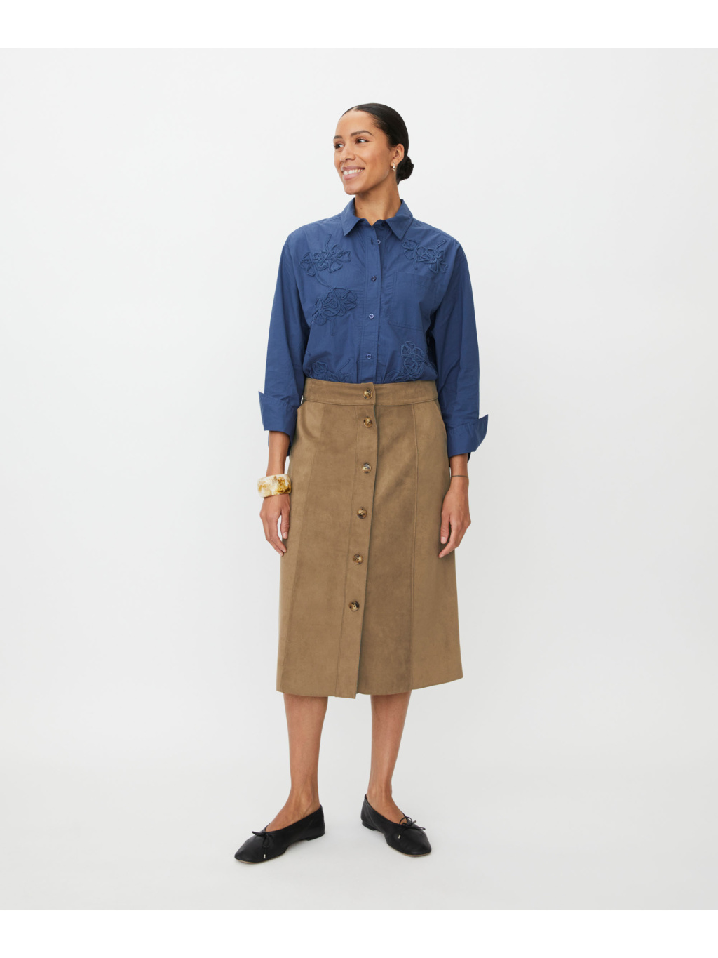 Střih sukně je lichotivý a promyšlený, krásně kopíruje siluetu bez zbytečného obepnutí. Přední zapínání na knoflíky dodává modelu charakter a opticky prodlužuje postavu. Délka je ideální jak do práce, tak na běžné denní nošení i elegantnější příležitosti.