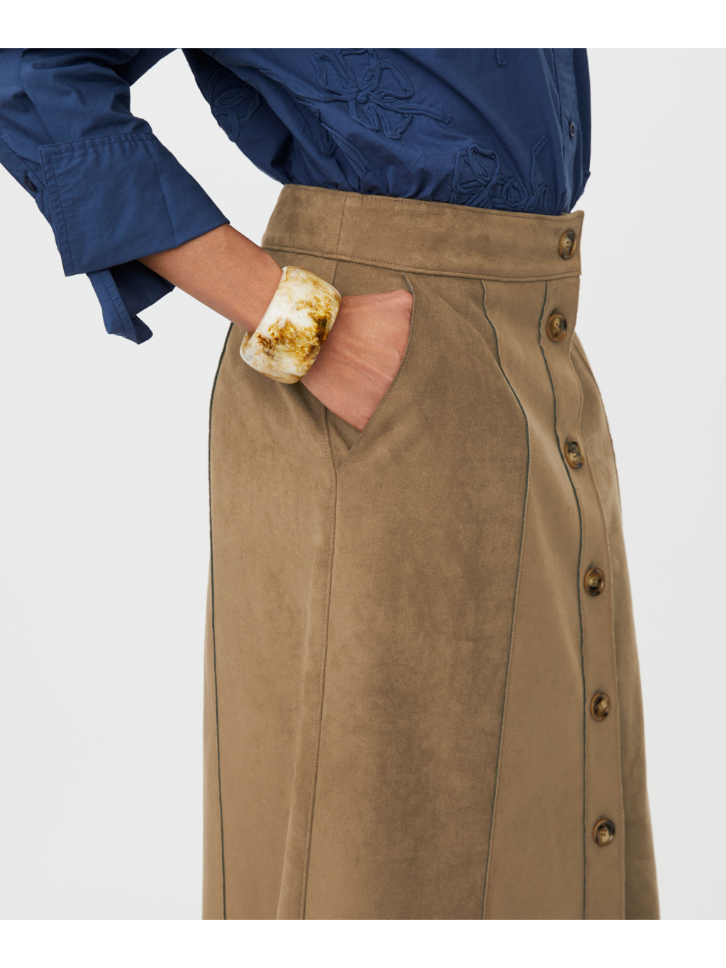 Sukně Synnora od značky MASAI je nadčasový kousek, který v sobě spojuje eleganci, pohodlí a všestranné využití. Je ušitá z jemné broušené koženky v camel barvě, která působí luxusně, ale zároveň je příjemná na dotek a komfortní při nošení po celý den.