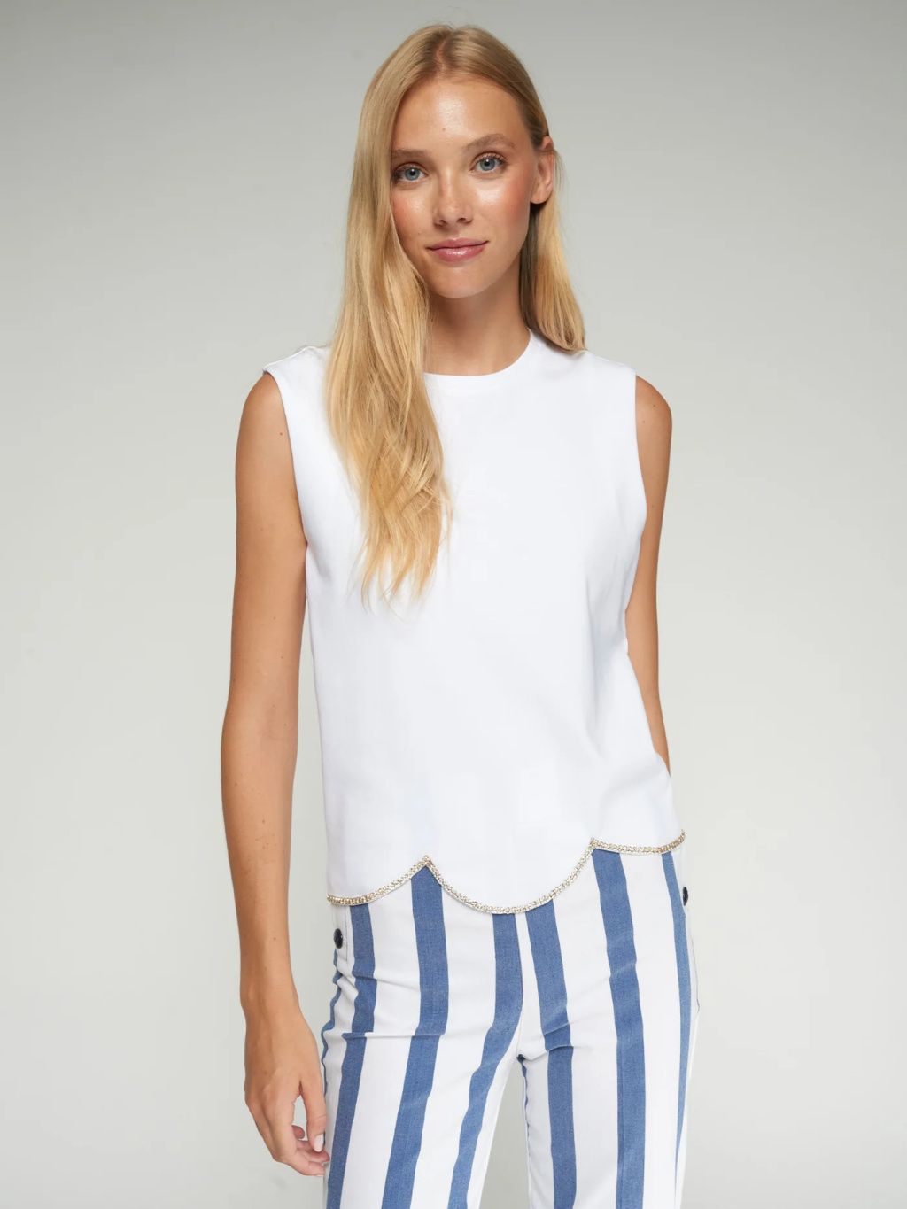 Jemně lesklý volánek podél spodního lemu promění jednoduchý bílý top v kousek, který snadno zvládne přesun z denního outfitu do večerního. Čistá silueta bez rukávů a kulatý výstřih působí minimalisticky, zatímco zvlněný lem ozdobený třpytivým detailem dodává celku lehký „party“ efekt.