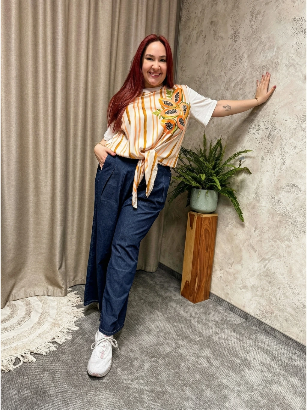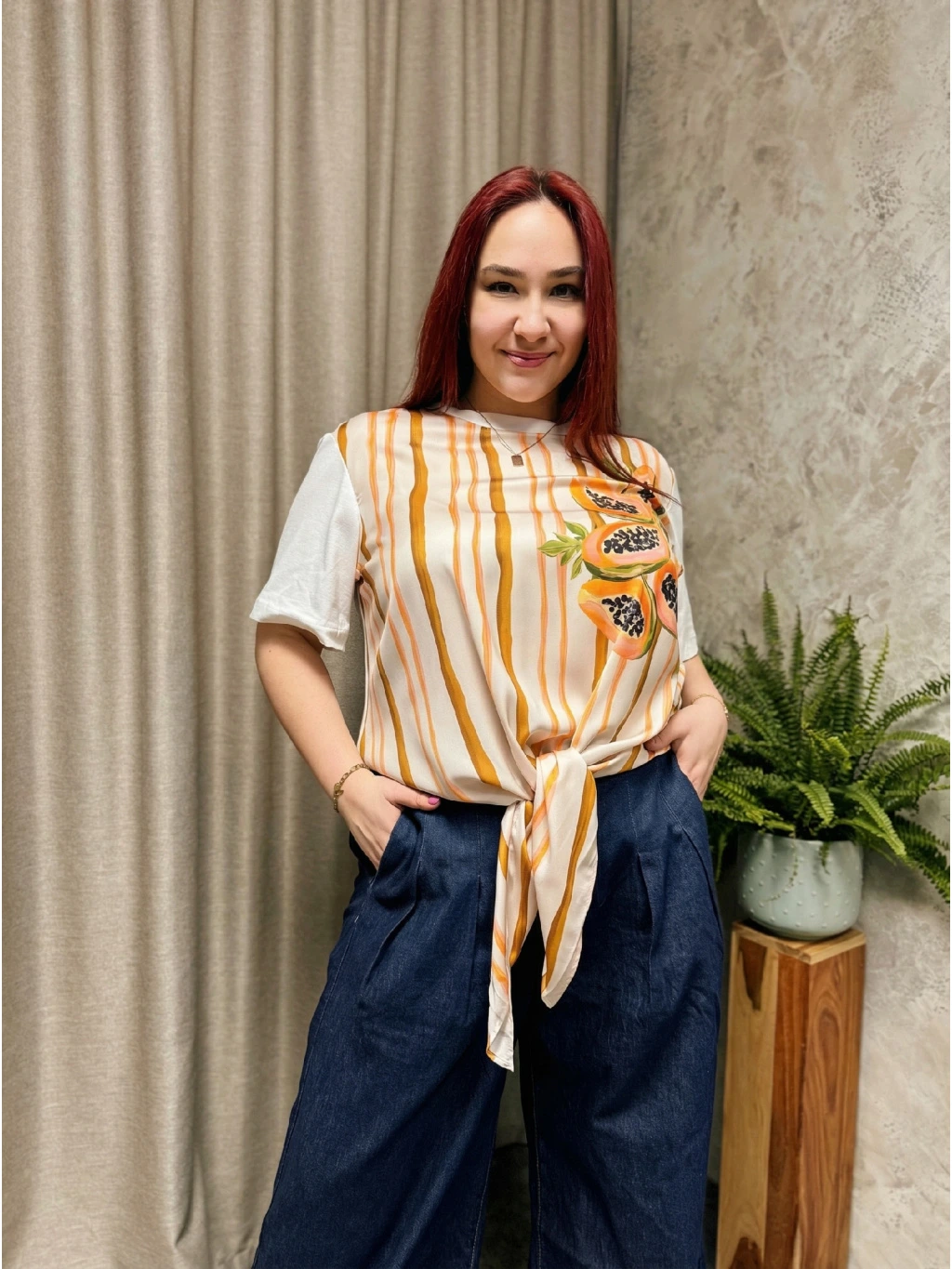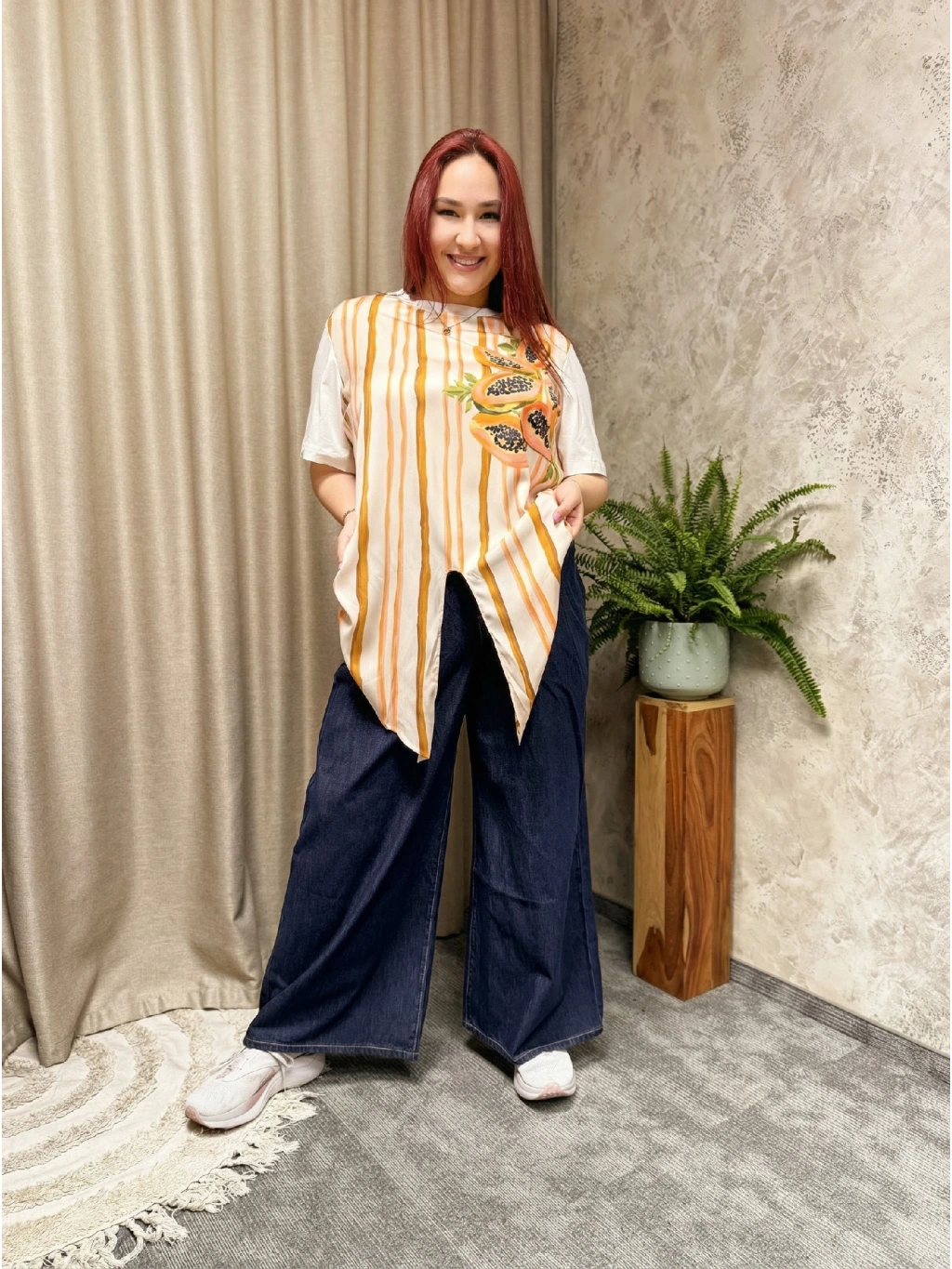 - 🍍 Originální papájový motiv a svislé pruhy v odstínech smetany, karamelu a oranžové – pruhy opticky prodlužují postavu