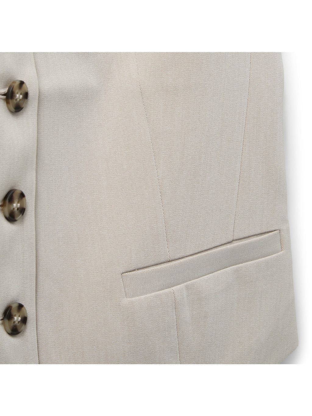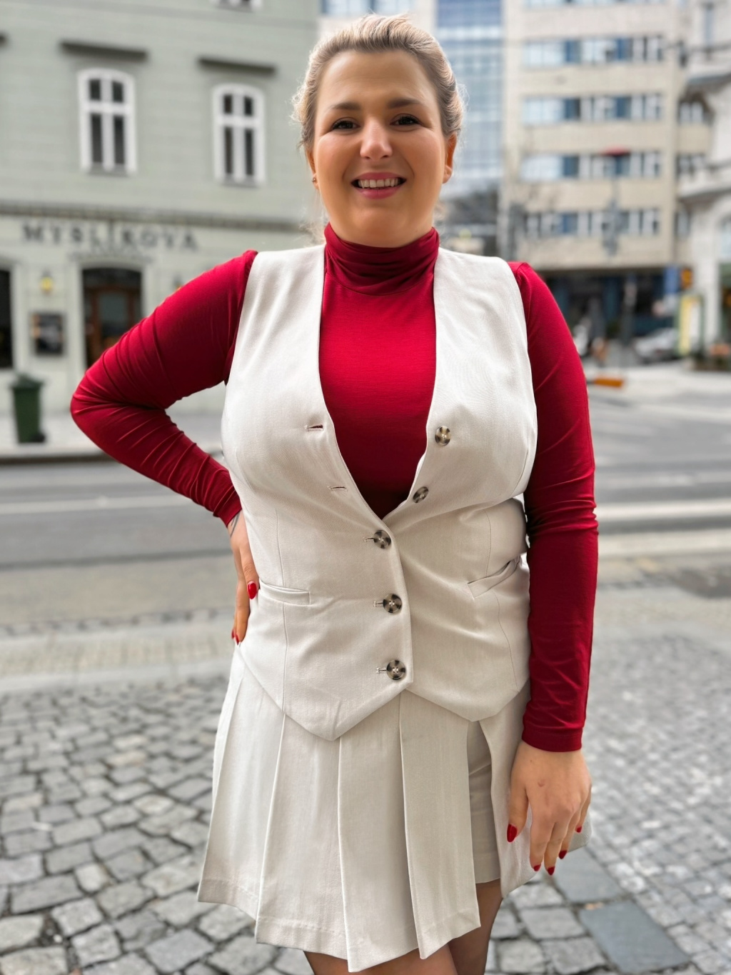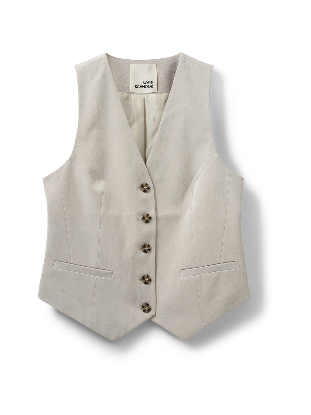 Krémová vesta Cleo od Sofie Schnoor má klasický, elegantní střih, který působí nadčasově a velmi upraveně. Celopropínací provedení s knoflíky podtrhuje čisté linie vesty, zatímco podšívka zajišťuje pohodlí a krásné držení tvaru při nošení. Decentní kapsy doplňují funkční stránku modelu, aniž by narušovaly jeho minimalistický vzhled. Krémový odstín dodává vestě lehkost a jemnost a umožňuje snadné kombinování s košilí, topem i sakem. Elegantní kousek, který přirozeně doladí sofistikovaný outfit.
