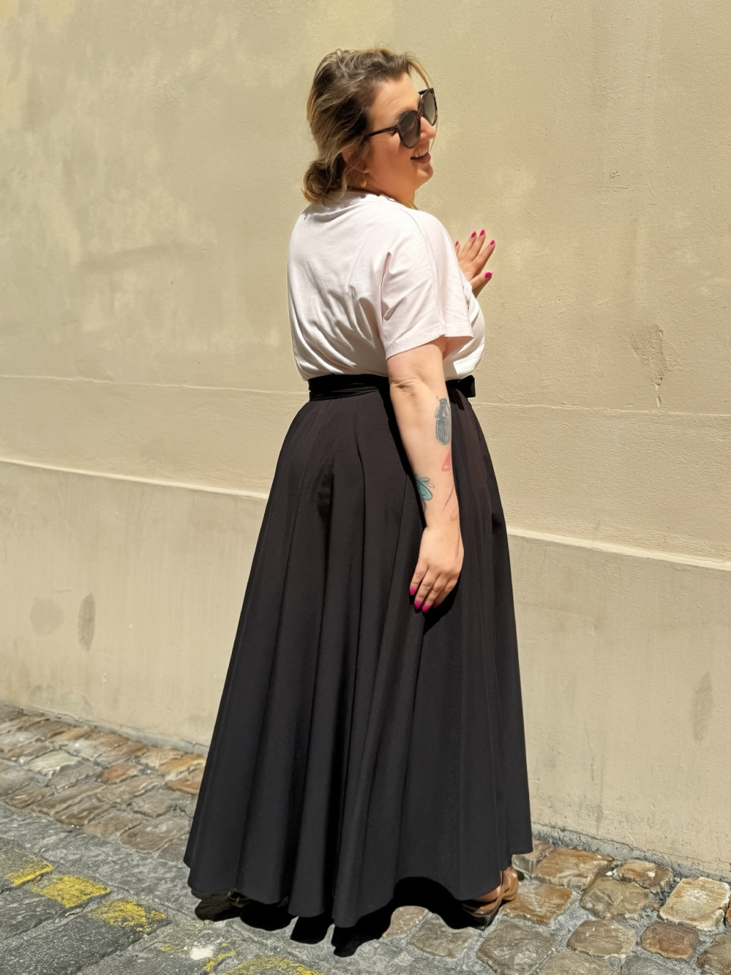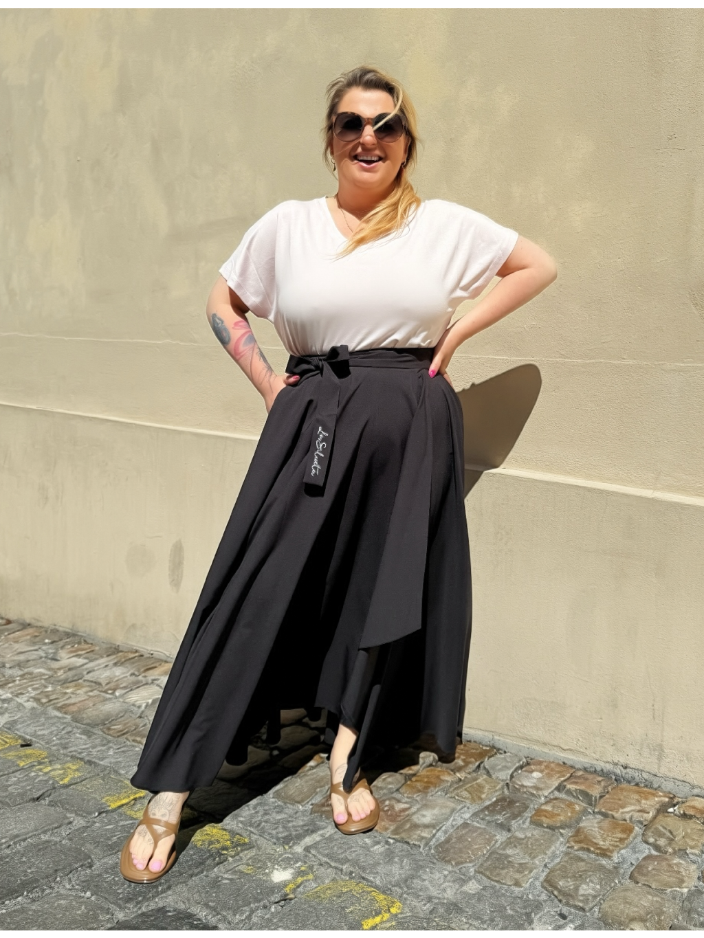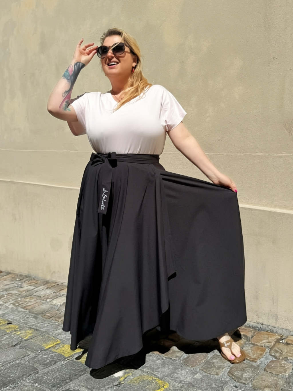 Zavinovací sukně, která zvládne všechno – od ranní kávy v kanceláři po večerní drink s kamarádkami. Model OLYMPIA BLACK v klasické černé barvě kombinuje ženský zavinovací střih s praktickými detaily a pohodlným materiálem, který se přizpůsobí každému pohybu.