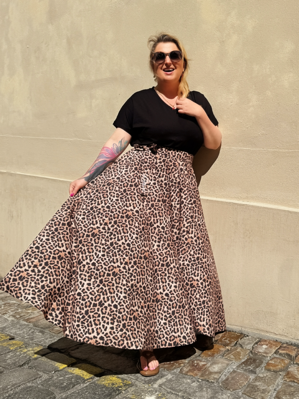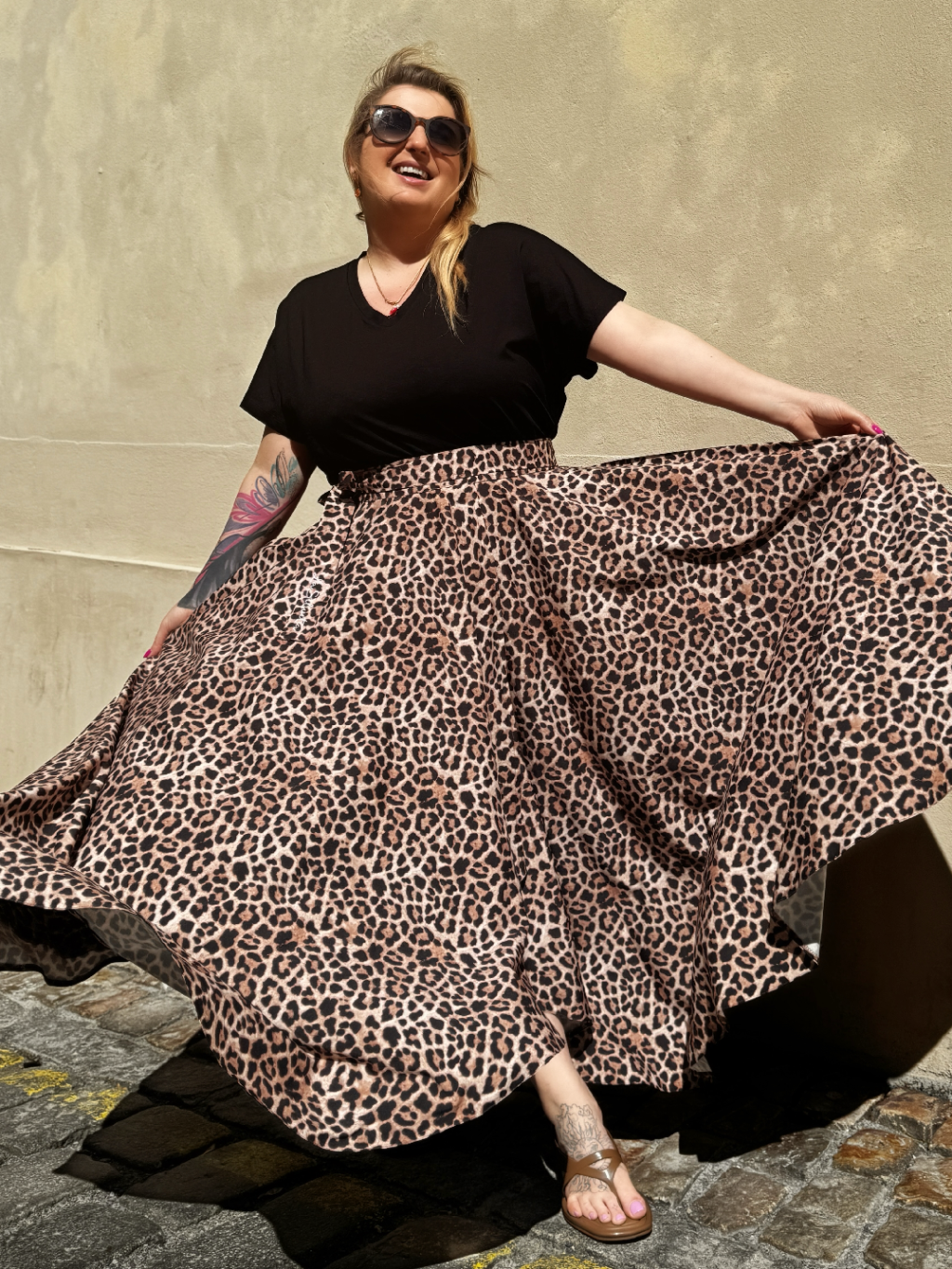 Divoká a sofistikovaná zároveň — zavinovací midi sukně Olympia v leopardím vzoru nabízí výrazný vzor s ženskou siluetou a praktickými kapsami. Pružný materiál zaručuje pohodlí a snadné přizpůsobení při nošení.